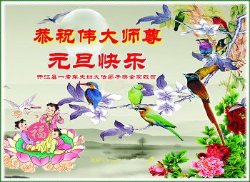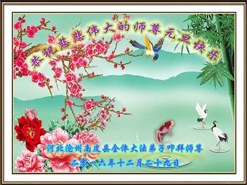 河北沧州南皮县全体大法弟子叩拜师尊,恭祝慈悲伟大的师尊元旦快乐! 辽宁省抚顺市清原县苍石全体大法弟子恭祝师父新年好!