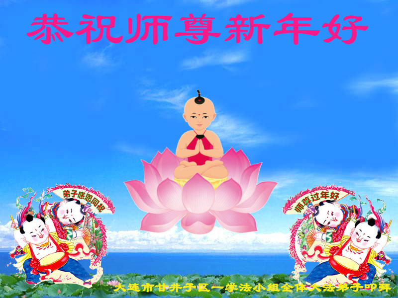 中国大陆大法弟子恭祝师尊新年好! 盼师回中土,盼神韵回大陆演出。 辽宁省大连市甘井子区一学法小组全体大法弟子恭祝师尊新年好!