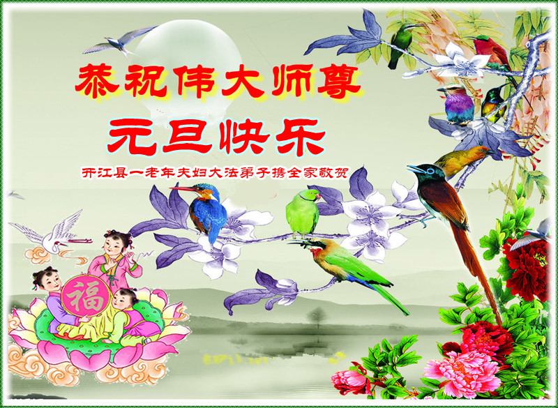 师尊辛苦了! 弟子们想您! 四川省达州市开江县一老年夫妇大法弟子携全家恭祝伟大师尊元旦快乐!