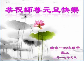 在2017年即将到来之际,来自北京市不同地区的大法弟子恭祝慈悲伟大的师尊新年好! 我们无法用人类的语言表达对师尊的感恩,每想到师尊为众生为弟子的巨大承受,我们都情不自禁的泪水涟涟,极尽我们的所有都无法报答师父的救度之恩!可是师父什么也不要弟子的,只要我们对师对法的一颗真心。 我们只有时时遵照师父的谆谆教诲,多学法,学好法,加强发正念,多救人,快救人,真修实修,兑现史前与师父签定的誓约!好跟师父回家! 北京市大法弟子敬上 黑龙江七台河夫妻大法弟子恭祝师尊新年好!
