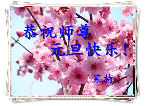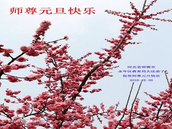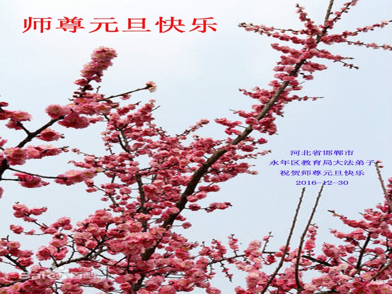 恭祝师尊新年快乐! 正法洪贯苍宇间 慈悲救度不曾闲 邪恶除尽阴霾散 春暖花开又一年 河北衡水市故城县一大法弟子恭祝师尊元旦快乐!