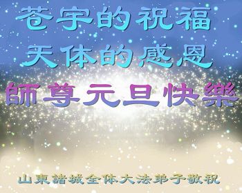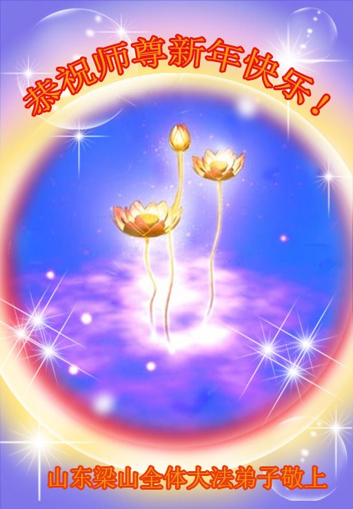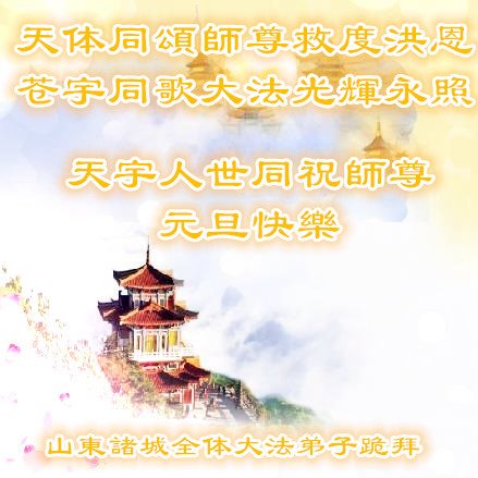 恭祝师尊:新年快乐! 整体升华,整体精進,抓紧最后的时间,抢人救人。 让伟大的师尊,多一份欣慰,少一份操心! 弟子们盼和师尊早日团圆! 叩拜 合十 山东省潍坊市诸城市两人学法小组大法弟子虔诚的恭祝慈悲伟大的师尊:新年快乐!