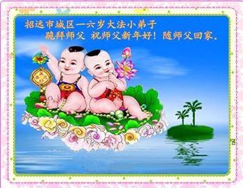 石家庄市新华区大法弟子一家三口恭祝师尊新年快乐!弟子们想念师父!我们一定带好小弟子,修好自己,多救人,让师父多一份欣慰,少一份操劳,圆满随师还! 河南鹤壁市大法小弟子恭祝师父元旦快乐!