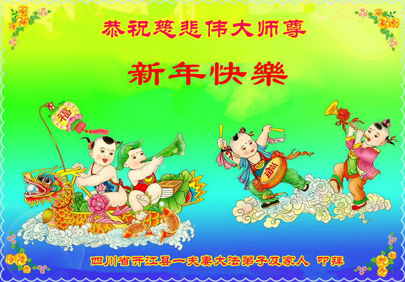 四川省达州市开江县一夫妻大法弟子及家人恭祝慈悲伟大师尊新年快乐!