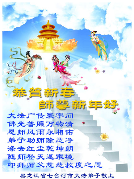 在全世界华人共度传统大年之际,我们学法组全体学员给师父拜年,祝师父新年快乐!万事如意。我们一定走正修炼的路,理智的做好三件事,请师父放心。 七台河市一学法小组 黑龙江大兴安岭漠河一大法弟子全家恭祝慈悲伟大的师尊新年快乐!