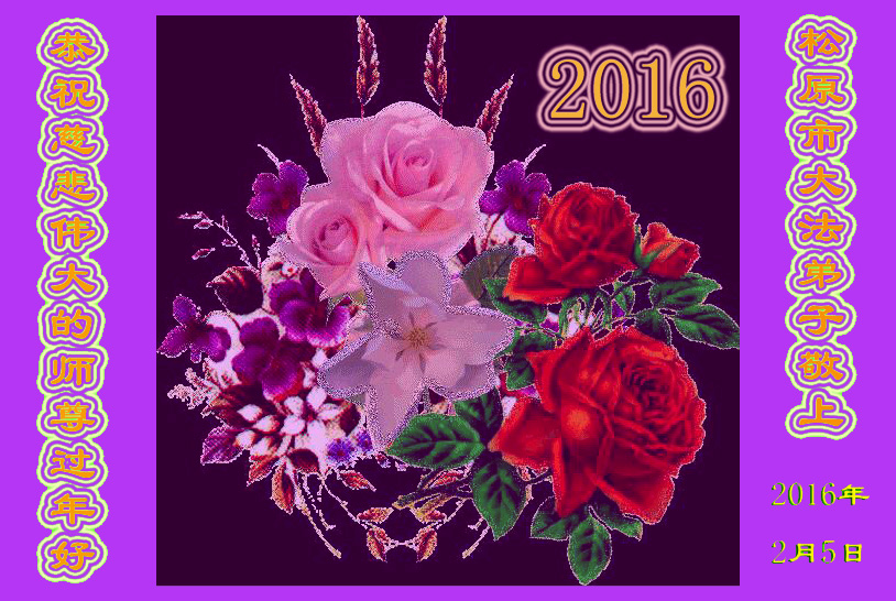 您的弟子和家人向您拜年了,师父过年好!感恩、叩拜慈悲、伟大师尊的慈悲苦度!师尊的洪恩是无法用语言表达的,一切交给师父,一切回归大法! 吉林大法弟子和家人敬上 二零一六年一月三十日 吉林省伊通满族自治县一大法弟子恭祝师尊新年快乐!