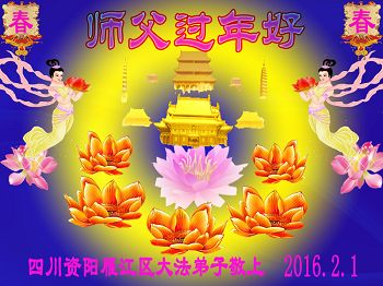 2016年新年来临之际,我们恭祝慈悲伟大的师父新年快乐! 我们是“七二零”之前就得大法的大法弟子,由于学法修炼不精進,人心执着多,怕心重,“病业”来时,悟性差,放不下人心,放不下吃药的心,很对不起师父的慈悲苦度。师父安排同修到家来交流鼓励,帮助我们提高和坚定了信师信法的信心。我们一定抓住有限的正法时机,用大法严格要求,修好自己,多救世人,跟师父圆满回家。 四川省开江县一对老年大法弟子 敬拜! 四川省德阳市一家大法弟子恭祝慈悲伟大的师尊:新年好!