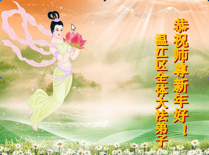 伟大慈悲的师尊在上,在这新年之际。请接受九个弟子的叩拜! 敬贺师尊新年快乐! 作为在法中深深受益的弟子,我们怀着万分感恩的心情,叩谢您的巨大付出与千辛万苦的救度之恩。 师父啊,您为众生巨大的付出使世人都在觉醒,都在支持反迫害,都在接受着大法的救度。 在这新的一年里,我们一定一如既往助师世间行,修好自己,做好三件事,仍然天天风雨无阻,到大街小巷、菜市场、购物场、公园……面对面讲真相、劝三:退.,把神韵光盘、真相资料送到世人的手上,我们不计众生什么态度,就是发大慈悲心救度众生。我们一定坚修到底,跟师父回家。 四川成都大法弟子 四川省成都市青白江区全体大法弟子恭祝师尊过年好!