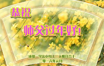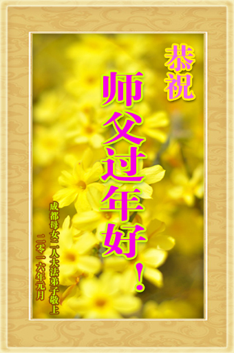 师父啊!您辛苦了!我是一个近九十岁的大法弟子,近二十年的修炼历程,在师父的无微不至的关怀呵护下走到今天,实在心中感恩不尽。我的生命是大法造就的,我的生命是师父给我延长来的。在新的一年里,按师父的要求努力做好三件事,决不掉队,跟师回家,请师父放心。 四川省成都大法弟子恭祝师尊过年好!