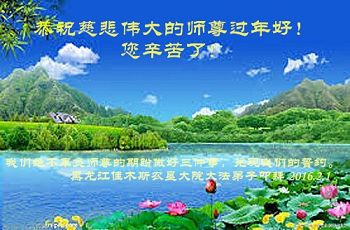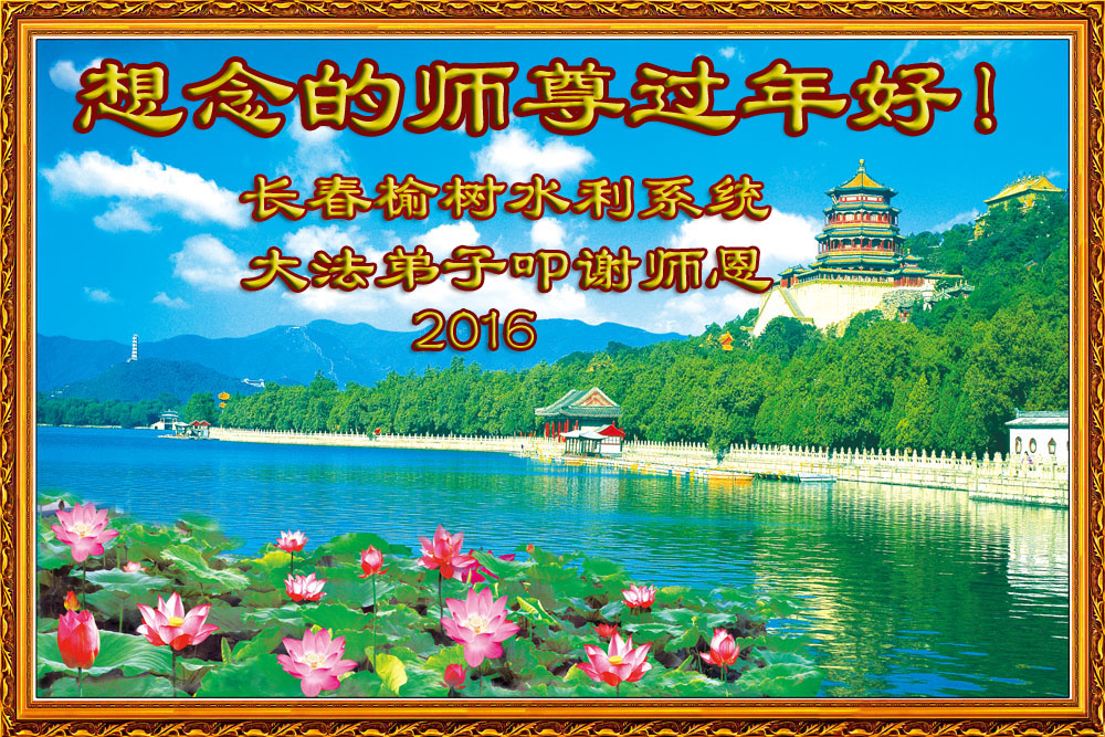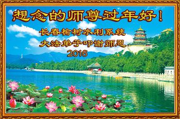师尊您好,您辛苦了!弟子在此祝您新年快乐!弟子深感自己距离法的标准相差甚远,决心奋起直追,做好三件事,完成自己的责任和使命。 佳木斯医疗卫生系统大法弟子 2016年1月23日 吉林省长春市榆树市水利系统大法弟子恭祝师尊过年好!