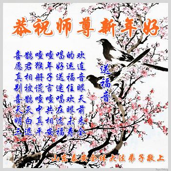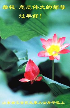 慈悲伟大的师父您好!在这合家团圆的日子里,弟子非常非常想念师父,弟子跪拜师父!弟子坚定的走在助师正法的路上,做好三件事,多学法,多救人,不辜负师父的慈悲救度,兑现史前誓约,随师返回真正的家园。 山东烟台开发区全体大法弟子向慈悲伟大的师尊拜年!师尊过年好!