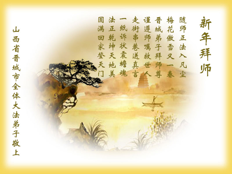 在新年到来之际,我们晋城市大法弟子向师父致以节日的问候!感谢师父的慈悲苦度!在新的一年里,我们要更加精進,继续做好三件事,多多救人,助师正法完成使命,圆满随师还。全体大法弟子合十叩拜 山西省晋城市阳城县全体大法弟子恭祝慈悲伟大的师父新年快乐!