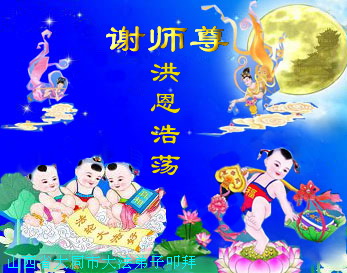 佛恩浩荡,师恩难报,千言万语都诉不尽弟子对师尊的感恩!弟子唯有严格要求自己,谨记师尊的教诲,时时用法纯净自己,牢记自己的责任与使命,放下一切人心与观念,全盘否定旧势力的安排,从人中走 出来。真正的把每一个应救的生命都救出来,做一个合格的弟子,跟师父回家。 山西省阳泉市矿区一学法小组恭祝慈悲伟大的师尊新年快乐!