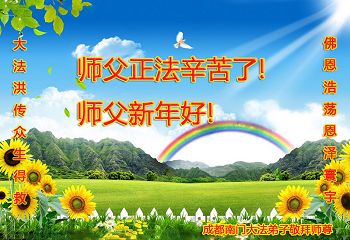 四川省成都大法弟子全家恭祝伟大慈悲的师尊新年快乐!