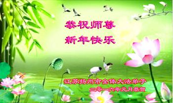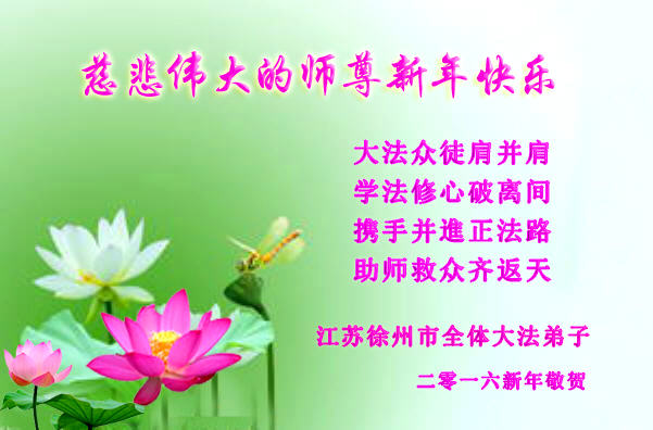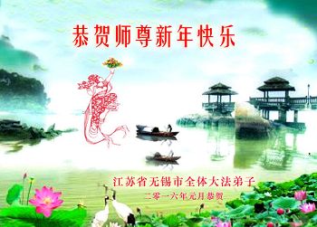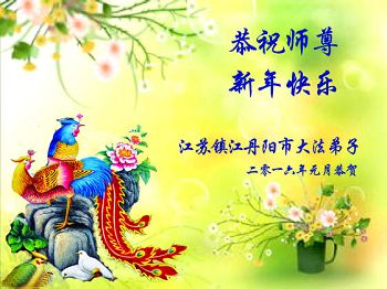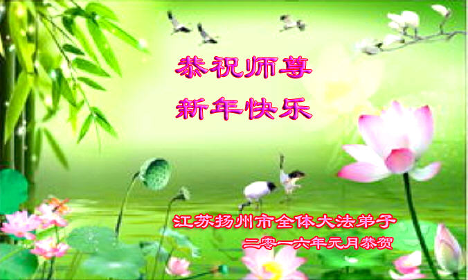 扬州地区大法弟子恭祝慈悲伟大的师尊新年快乐!弟子一定听从师尊的谆谆教诲,完成自己的使命,圆满随师还。 二零一六年一月二十七日 江苏省盐城一大法弟子全家恭祝师尊过年好!