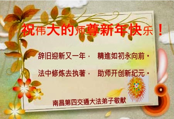 每当新年与旧岁更替的时候,心中更多的感触是对师尊的感恩!师尊用巨大的承受为弟子延续来的时间是为了让弟子们在很有限的时间里抓紧时间修好自己,救度有缘的众生;同时也为众生延续了可以得救的时间!每 当想到这里,心中总觉的愧对师尊的慈悲,因为修的并不够好,与师尊的要求还差的很远。可是师尊从来都是用洪大的慈悲包容弟子们,总是鼓励弟子们没做好时不要懈怠、不要停滞,往前行继续做好,而且无时无刻 的在每个弟子身边慈悲呵护与悉心点悟,我们才可以在各自的修炼路上走的顺畅平稳,其中包涵着师尊的苦心与艰辛!慈悲伟大的师尊谢谢您!为了弟子们与无量众生,您辛苦了!新年的脚步近了,我们修炼路上的脚 步也要加紧了!未来的日子里我们要抓紧时间修好自身,讲清真相,救度更多的有缘人,发好正念,学好法,把法装在心中;解体邪恶迫害,让所有被非法关押在邪恶黑窝被迫害的大陆同修们都回到正法的洪流中来! 新的一年即将来临,过去的一年让师尊操了不少心,新的一年希望让师尊欣慰! 江西省大法弟子恭祝师父新年快乐!
