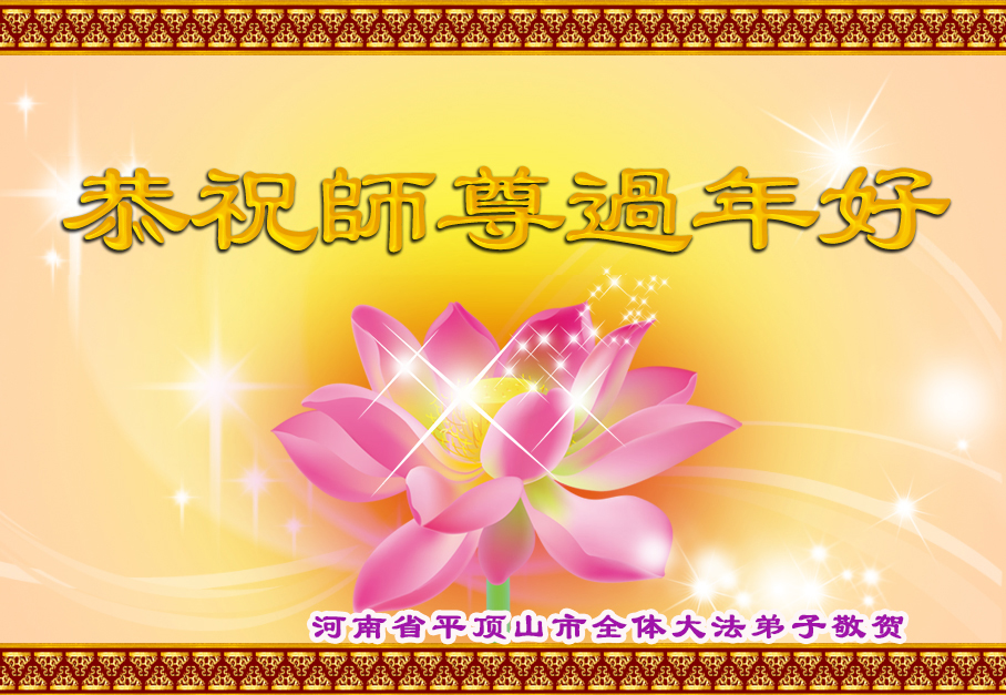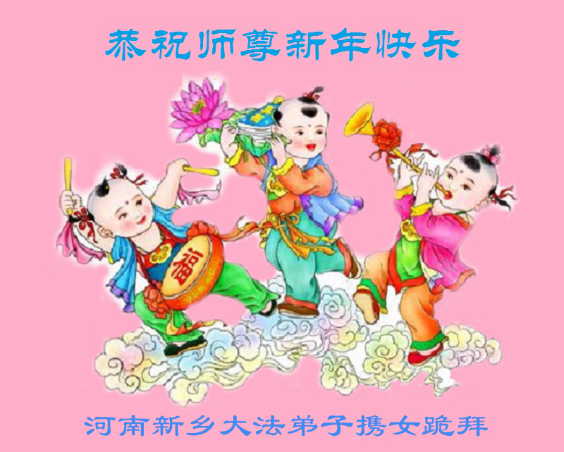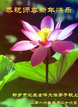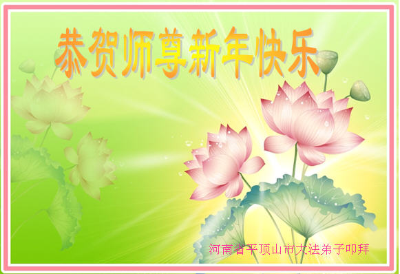 15年已经过去了,让人感觉时光过的真快,转眼功夫,又一个的新春佳节又到了。忆往昔师父为弟子们操劳万千,怎么说我们也无法表达对师恩浩荡的感谢之意,在这辞旧迎新的时刻,您的弟子们给师父拜年了!衷心祝愿师父节日愉快,万事如意,笑颜长开!合十! 河南项城市大法弟子跪拜! 河南省新乡一学法小组全体法轮大法学员恭祝师尊新年快乐!