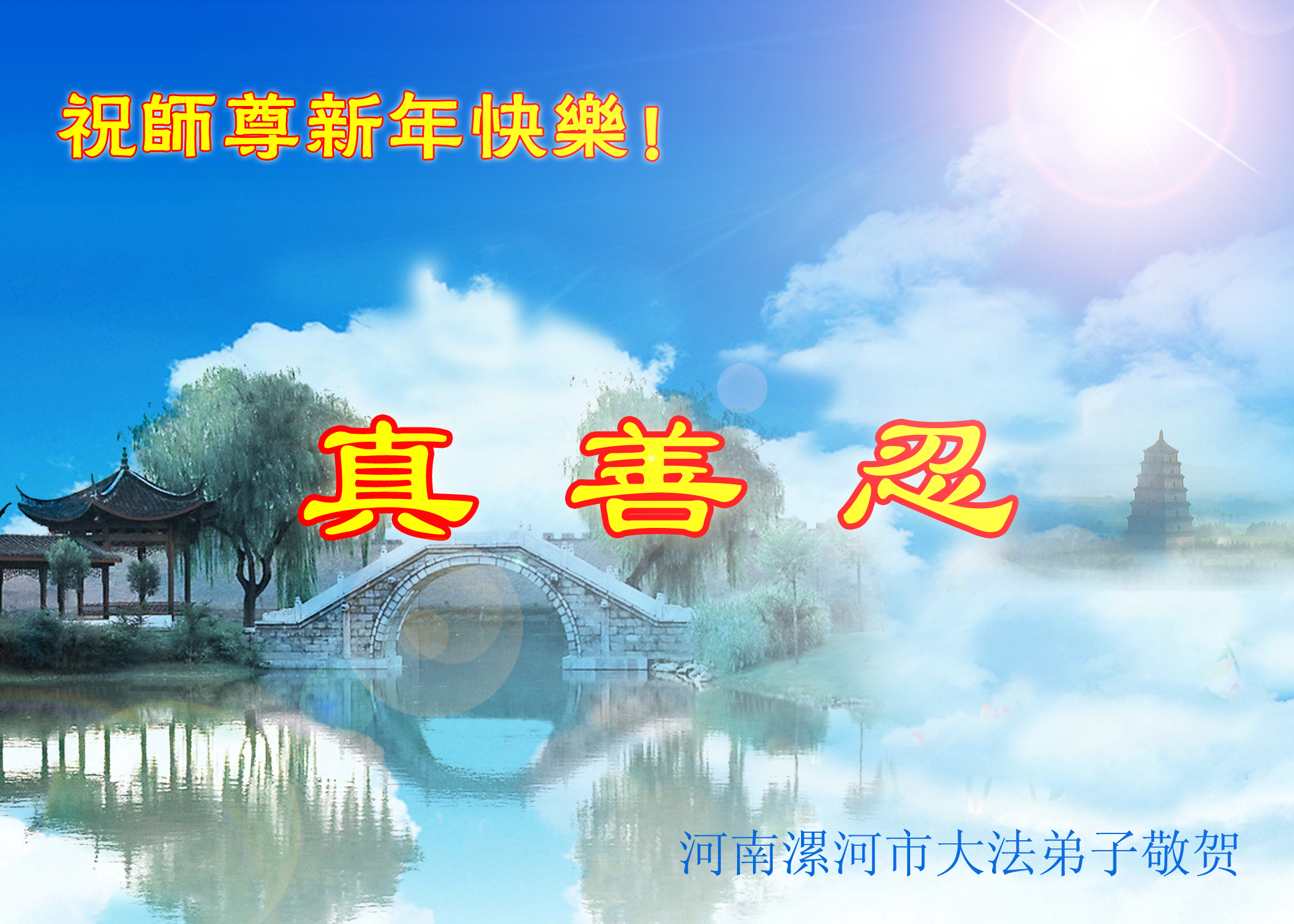 师恩浩荡,无以为报。在新的一年里,牢记师父的嘱咐,修好自身,做好三件事,证实大法,解体迫害,多多救度有缘人,让师父少承受一些,让师父多欣慰一些。做好一切该做的,迎接师父归来。 河南淮阳大法弟子祝师父新年快乐!