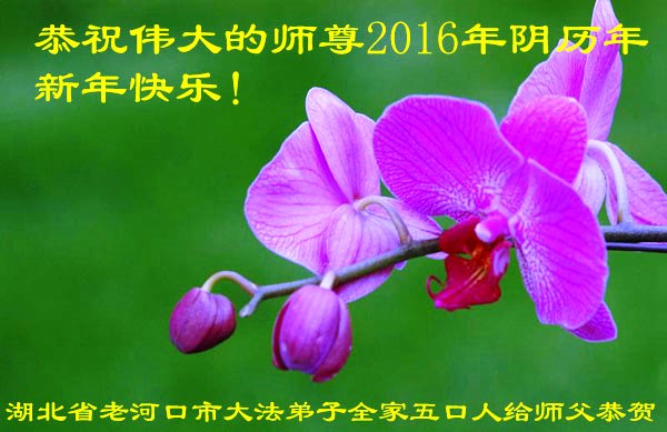 【明慧网二零一六年二月七日】 湖北省襄樊市老河口市大法弟子全家五口人恭祝慈悲伟大的师尊2016年中国新年快乐!