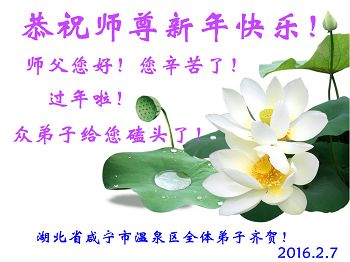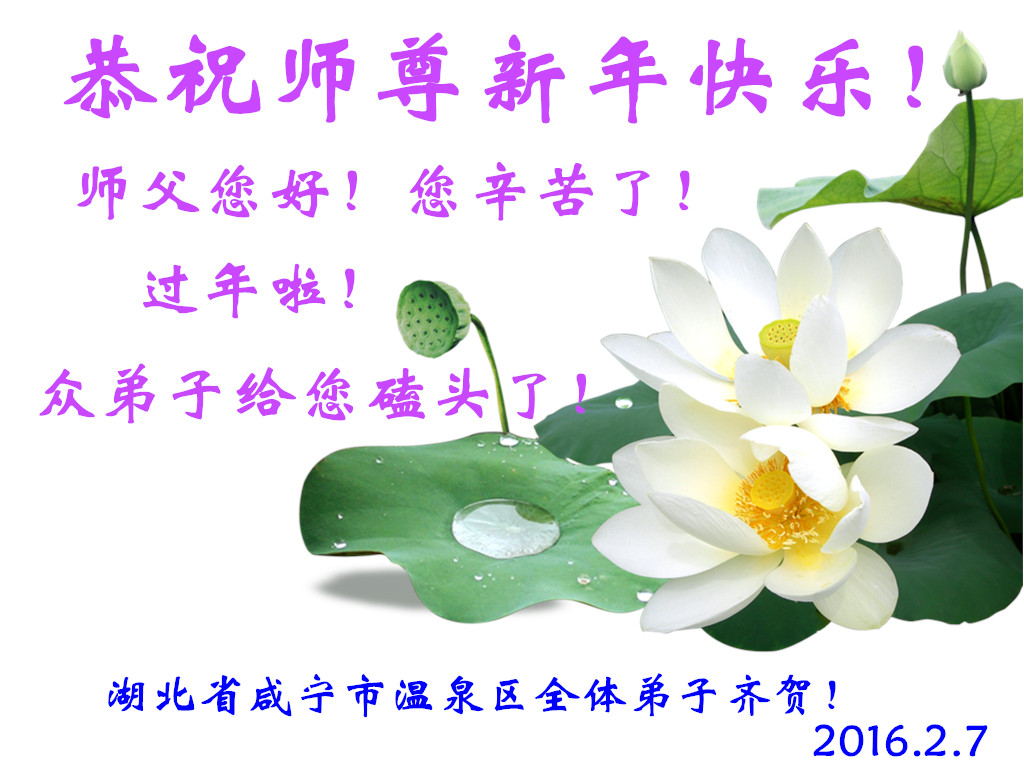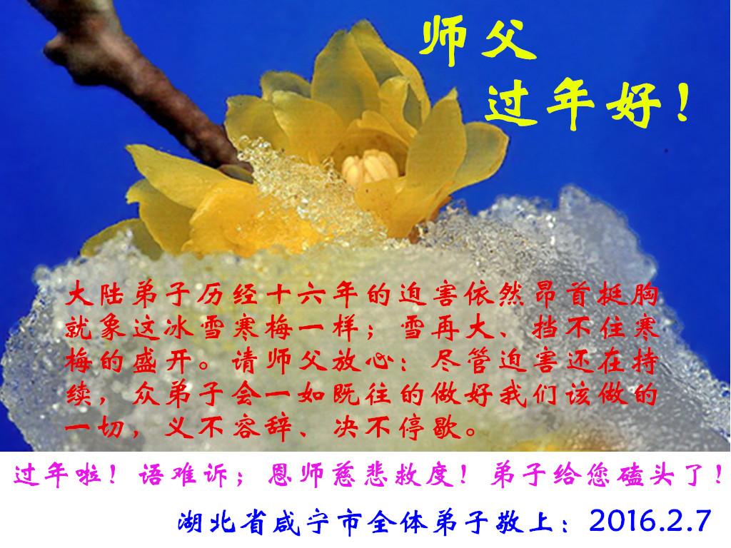 给师尊叩首拜年! 又逢佳节倍思亲 亿万徒儿想师尊 日夜操劳可安好 弟子精進请放心 经文在手勤诵读 誓约于辛苦践行 救度大恩岂言报 唯有正念多救人 二零一六年元月二十三日 湖北省十堰市全体大法弟子给师父的拜年贺卡