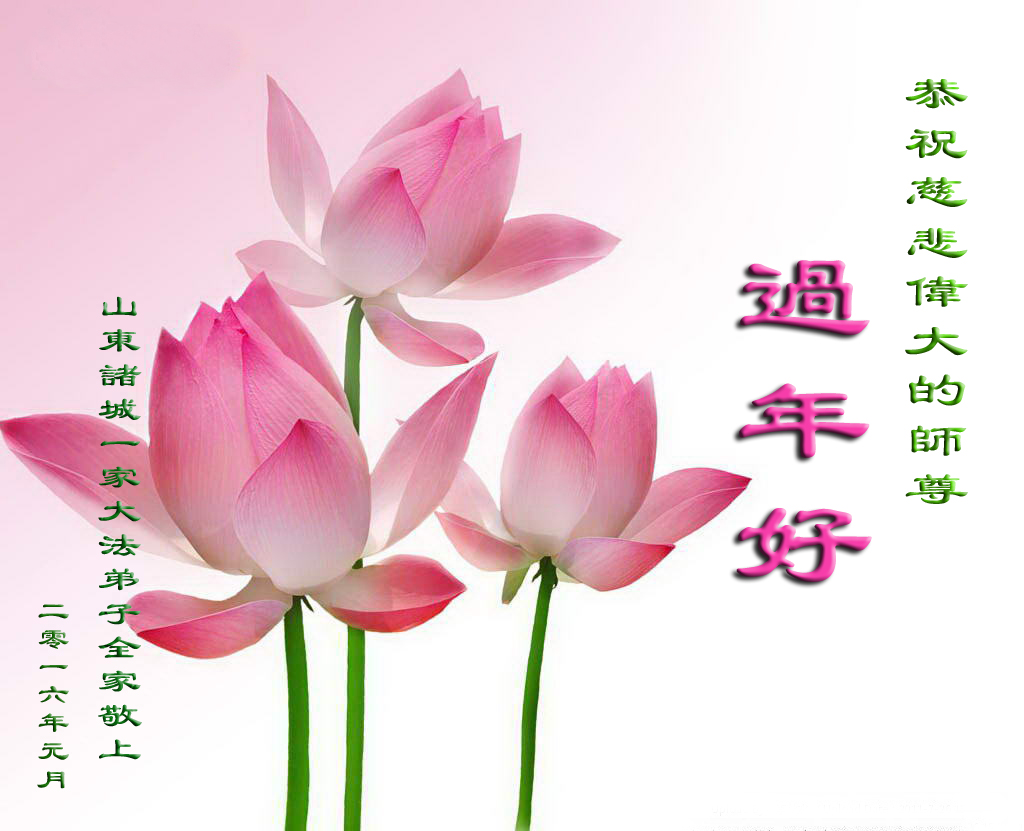辞旧迎新年,大法在弘传。大法弟子在修炼中辞去了二零一五年,我们又迎来了二零一六年。在新年来临之时,首先恭祝我们慈悲伟大的师尊新年好,新年快乐! 在十几年的修炼中,我经过了风风雨雨与种种魔难。在魔难中,是慈悲伟大的师尊手把手的领着走过来的,呵护着弟子一步步走到今天,慈悲伟大的师尊用无量的付出替弟子承受着生生世世欠下的天大的业债,师尊的慈悲伟大、良苦用心弟子用语言无法表达,弟子只有精進实修,多学法、学好法,听师尊的话,做好三件事,在最后值千金、值万金的宝贵时间里多救人,才能报师恩。在修炼中遇到矛盾找自己,向内找,争取早日跟师尊回家,请师尊放心。弟子叩谢师尊,叩谢再叩谢。 山东潍坊寒亭区大法弟子 五人学法小组 山东潍坊市昌邑市一大法弟子全家恭祝师父新年好!