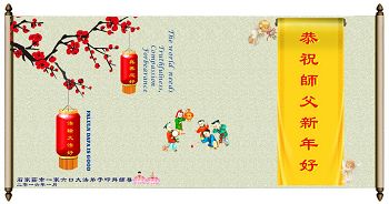 师尊您辛苦了!千言万语也难以表达弟子们对师尊的感恩之心!唯有学好法,抓紧时间做好三件事,多救人,精進、再精進。让师尊多一份欣慰,少一分操劳。 弟子们叩拜师尊! 夏历乙未年腊月二十三敬上 河北石家庄裕华区一老年大法弟子及家中常人给师尊拜年!