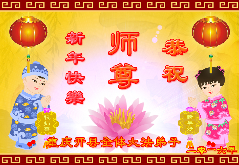 重庆市江北区一学法小组全体大法弟子恭祝慈悲伟大的师尊过年好! 在二零一六年新年来临之际,弟子在重庆给师父拜年了!师父啊,在这正法最后时刻,我们一定牢记师尊教诲,更加努力做好三件事,与同修共同精進,修好自己,多救众生,兑现我们的神圣誓约,感谢师尊的慈悲救度。 重庆市潼南区全家十一大法弟子恭祝慈悲伟大的师尊过年好!