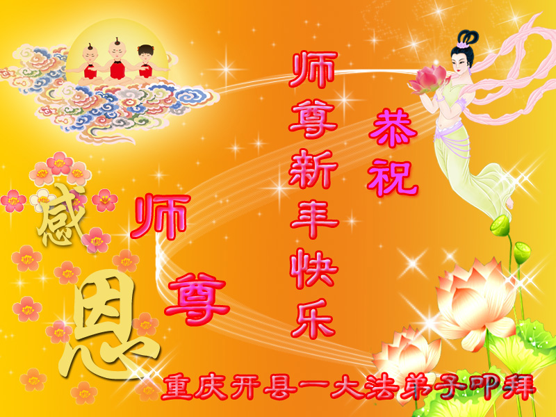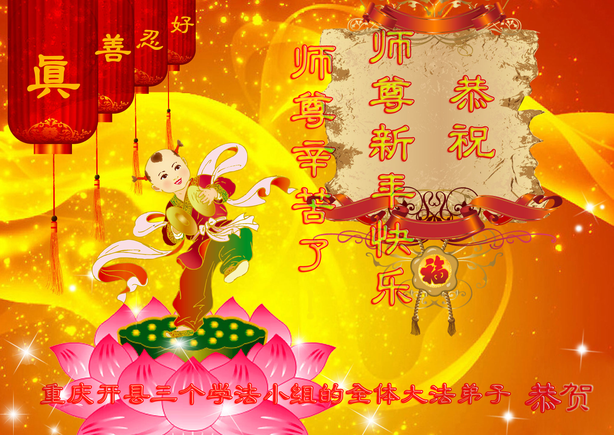 师尊您好!师尊辛苦了!我们重庆石油大法弟子给您叩首了! 千言万语无法表达我们的感恩,您的洪大慈悲惠及整个天体的众生,没有您的救度,没有您的无量承受,人类走不到今天,天体众生早已完结。用尽人类的语言也无法表达我们对你的感恩,感谢您无量的慈悲,感谢您巨大的付出。我们一定不负您的嘱托,修好自己,多救众生。坚定的走好最后的路,圆满完成我们的使命,兑现我们的誓约,请师尊放心。 再次恭祝师尊过年好! 重庆石油大法弟子 重庆合川一家大法弟子恭祝师尊过年好!