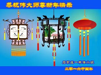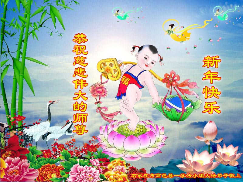 我们会在新的一年里做好三件事,修好自己,多救人,请师父放心。谢谢师父! 河北省石家庄市深泽县赵八乡一学法小组全体大法弟子给师父拜年!恭祝慈悲伟大的师尊新年快乐!