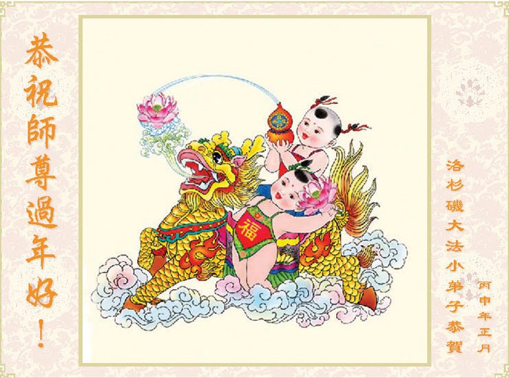 爆竹声声新年到 祝愿师尊新年好 为救洪穹传天法 正法洪势满人间 学法炼功多救人 随师正法发正念 黑手烂鬼蟾妖炸 三:退.世人保平安 金猴吉祥太平年 千家万户合家欢 识破谎言见光明 人人争抢看神韵 锣鼓欢歌过大年 龙飞凤舞神迹显 真相大现返家园 美国亚利桑那州坦佩地区学法小组恭祝师尊中国新年快乐! 美国德州奥斯汀大法弟子恭祝师父新年快乐!