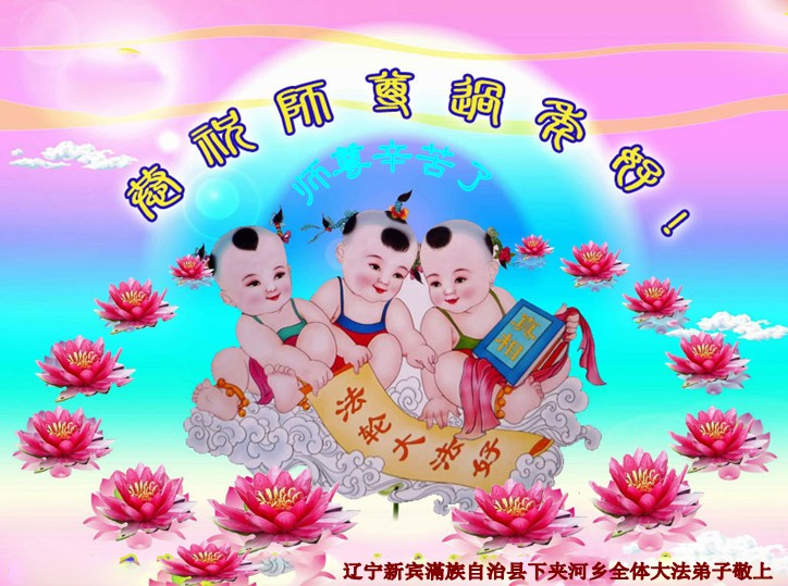 师父好!弟子向伟大慈悲的师父拜年!感谢师父呵护弟子们能得法与证实法。弟子一定牢记师父教诲,修炼如初,不放松,抓紧时间多学法,向内找,正念正行多救人。请师父放心!感恩师父! 辽宁新宾满族自治县下夹河乡全体大法弟子恭祝师尊新年好!