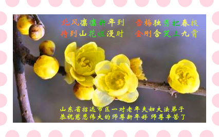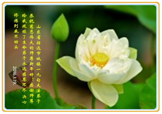 师父新年好!我是一名老年大法弟子,五年前我回到山东老家,由于联系不到当地同修,这几年我修的很苦、很累,时常以泪洗面。师父看到了我的这颗心,在师父的慈 悲安排下,去年我找到了当地同修,当时我就象找到了亲人一样的感觉,高兴极了。今后,我要更好的和同修配合好,做好三件事,圆满随师还。 山东烟台大法弟子恭祝师父新年好!