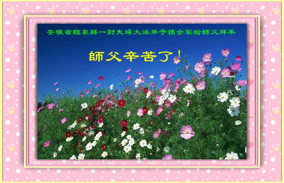 安徽省阜阳市临泉县一对夫妇大法弟子携全家恭祝师尊过年好!