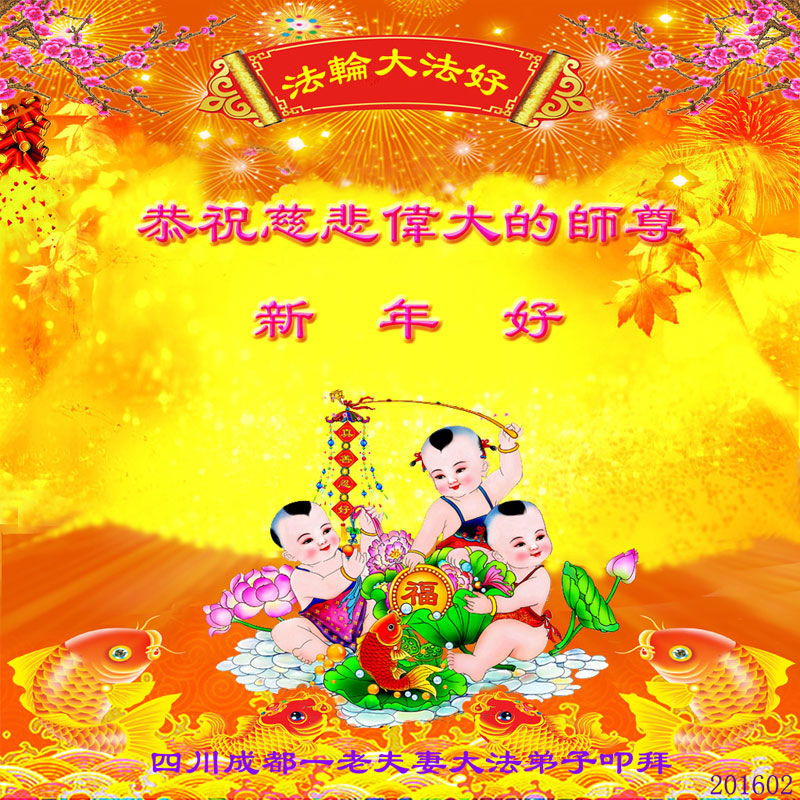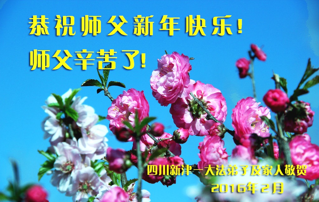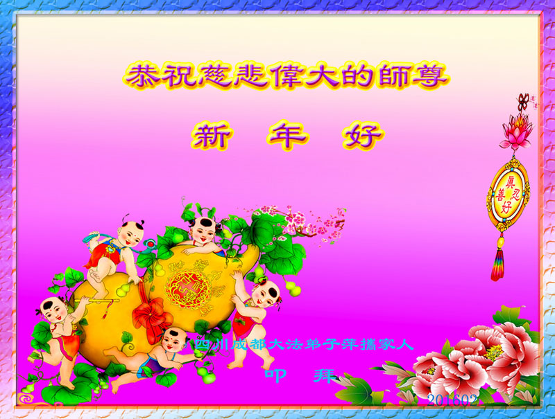 新年到 问师好 三件事 记得牢 诉江潮 逐浪高 促三:退. 众生笑 除恶尽 迎春到 谢师恩 佛光照 成都大法弟子叩拜师尊 合十 二零一六年一月二十五日敬献 四川省成都一大法弟子恭祝师父新年快乐!