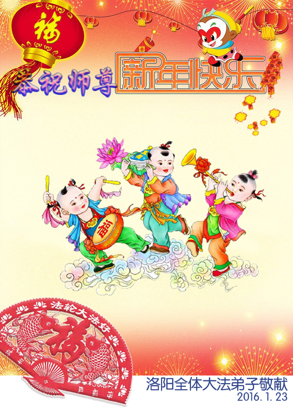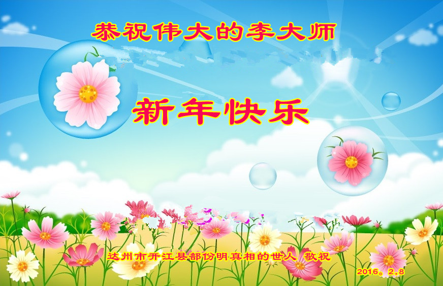 弟子们感恩师尊的慈悲救度!师父您辛苦了! 弟子们无法表达对师父的感激之情,唯有精進报师恩! 感谢师父无微不至、无所不在的慈悲呵护,弟子们才能在风雨中走过二十年。今生能成为大法弟子是我们永远的荣幸,感恩师尊当初选择了我们、赐我们助师正法的机会,弟子们倍感荣耀!感恩!弟子们一定精進报师恩! 正法越到尾声对弟子们的要求就越高,弟子已深刻的认识到修炼的严肃与时间的紧迫,我们一定抓紧时间多学法,彼此配合好,最大程度用好大法资源,做好“三件事”,多救人!不负众生的期盼与恩师的期望。 再次感恩师尊救度!同时也替明真相的常人问候师尊,恭祝师尊新年好! 洛阳全体大法弟子 2016.1.23 四川省达州市开江县部份明真相的世人恭祝伟大的李大师新年快乐!
