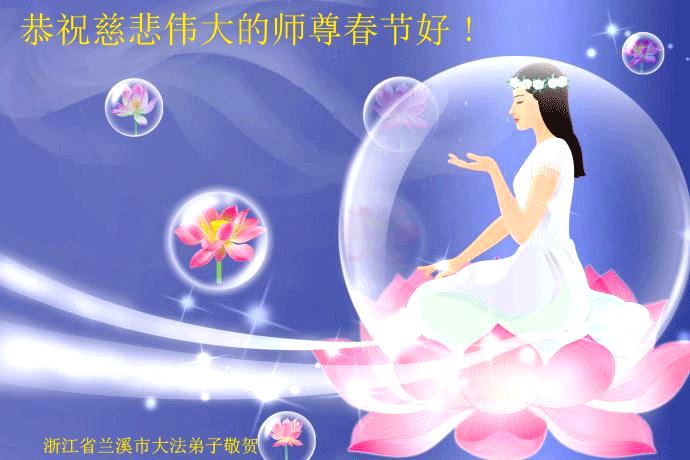 值此新年到来之际,浙江省兰溪市全体大法弟子恭祝慈悲伟大的师尊新年好!同时感谢师尊对大法弟子及觉醒众生的慈悲救度! 弟子们会继续努力做好三件事,扎扎实实的学好法,不断的修去人心,不辜负师父的慈悲苦度,完成史前誓约,圆满随师还! 浙江省兰溪市全体大法弟子 敬上