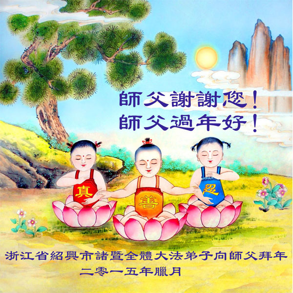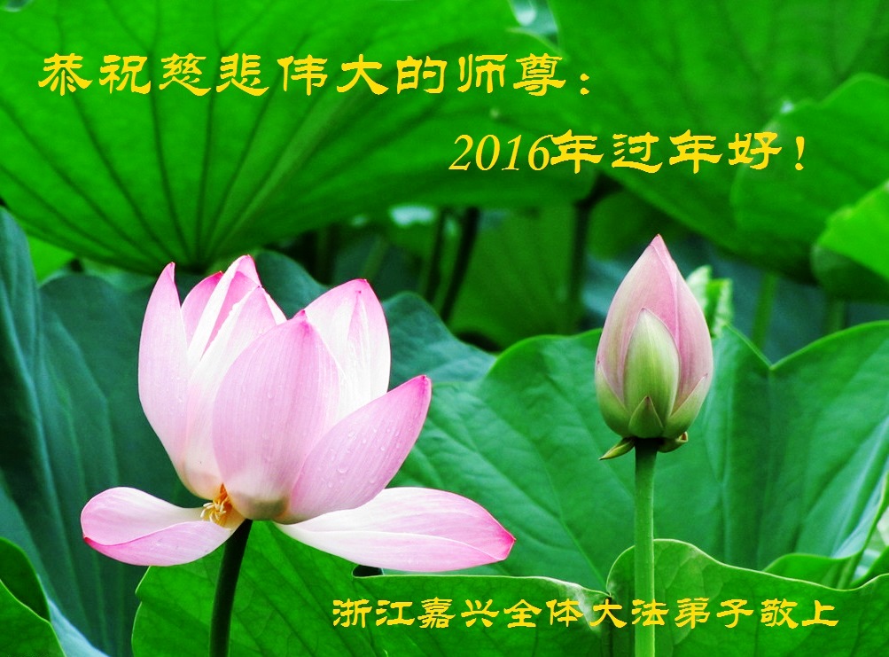 师尊:您好!时间过得真快,不知不觉修炼已十几年过去了。弟子们唯有多学法,努力精進,做好三件事,同时修好自己,才能跟上师父正法進程,助师世间行,圆满随师还! 浙江嘉兴全体大法弟子恭贺师尊2016年过年好!