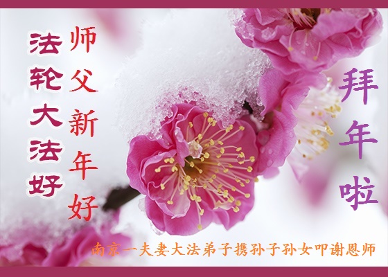 江苏省南京一夫妻大法弟子携孙子孙女恭祝慈悲伟大的师尊过年好!