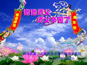 叩谢师恩!恭祝师尊新年快乐! 新的一年就要到了,回顾过去,我们感到无比惭愧,没有做好师父交待的三件事,辜负师父的慈悲苦度。展望未来,从今开始,抓紧做好三件事,兑现誓约,完成历史赋予我们的使命,坚决跟师父回家! 2016年02月02日 辽宁省丹东市凤城市通远堡镇大法弟子给慈悲伟大的师父拜年!