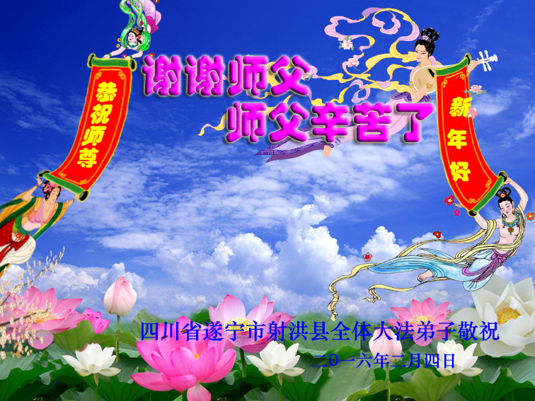 师父辛苦了!弟子们感谢您。 四川省遂宁县射洪县一学法小组全体大法弟子恭祝慈悲伟大的师尊新年快乐!