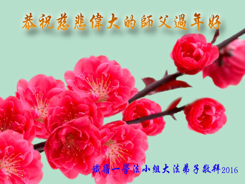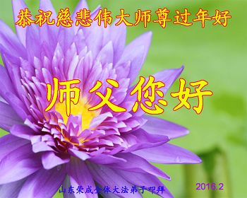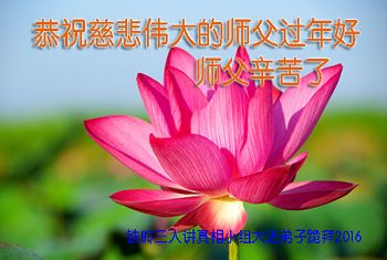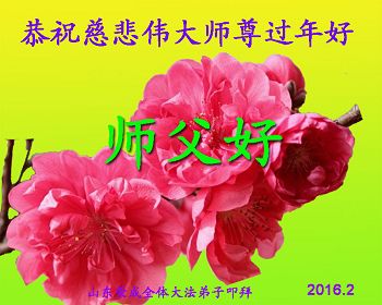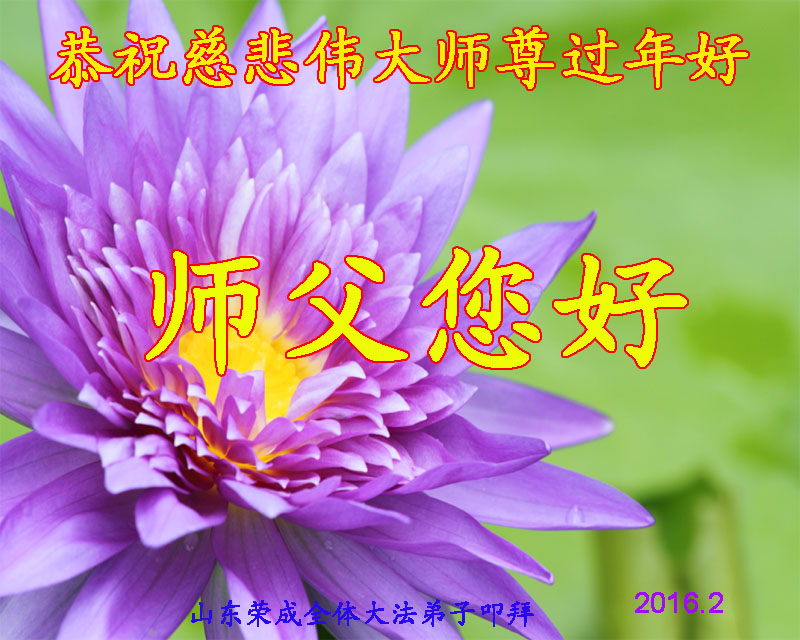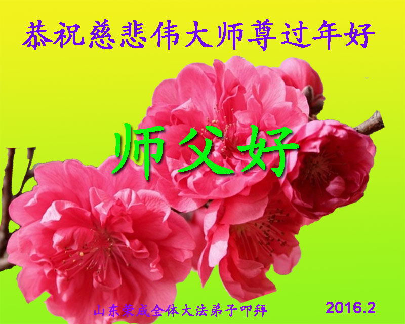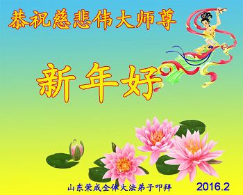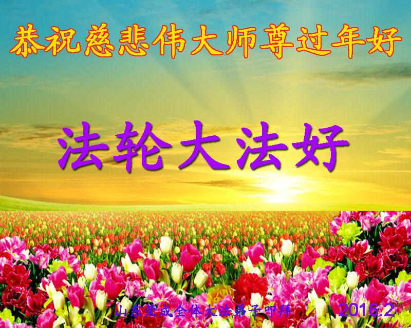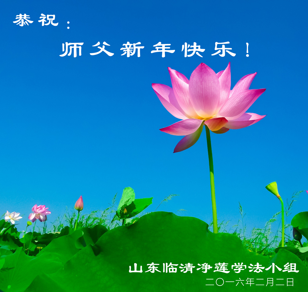 二零一六年,中国传统的新年—团圆年将至,弟子们想念师父,期盼师尊早日归故里和弟子们共欢度新年。在此弟子们给师父拜年了!感恩师父的慈悲苦度、感恩师父的一路呵护!弟子们一定倍加珍惜师父以巨大的承受与付出延续来的宝贵时间,在新的一年里,修好自己、做好三件事、学好法向内找,努力提高心性。同化大法、整体升华,走好师父安排的路,完成史前大愿! 山东临清二个学法小组弟子敬上 2016年1月30日 大陆一学法小组全体大法弟子恭祝师尊新年好!