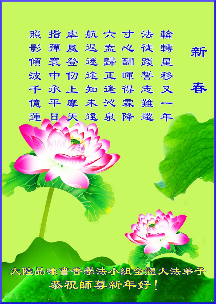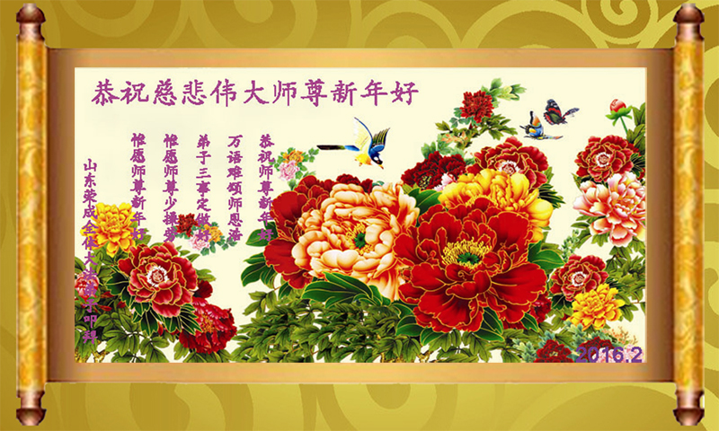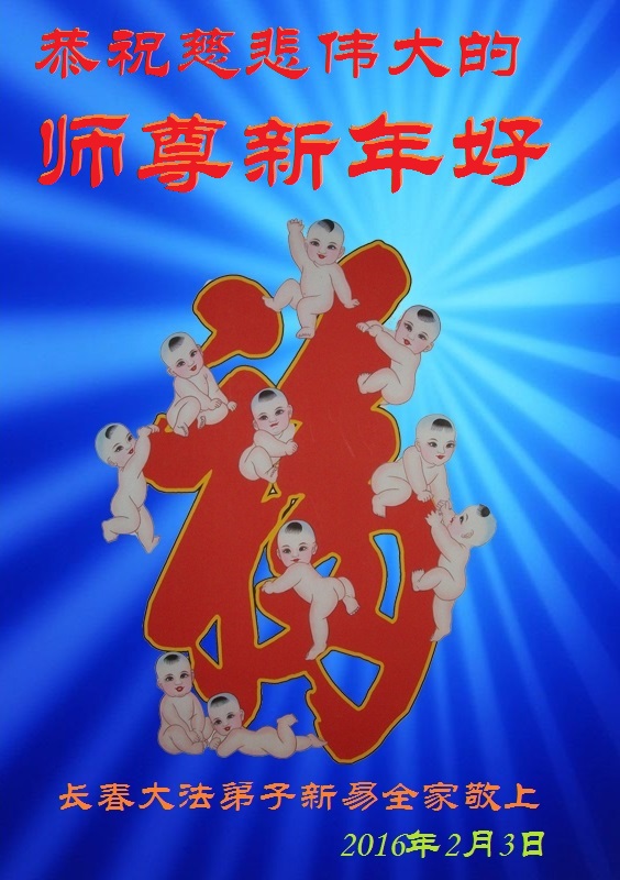 东营市垦利县胜陀镇全体大法弟子及家人,恭祝慈悲伟大的师尊新年好!请师尊放心,弟子们在正法路上精進实修。弟子们想念师父,盼师尊早日回大陆。 四川资阳大法弟子恭贺慈悲伟大的师父新年好!