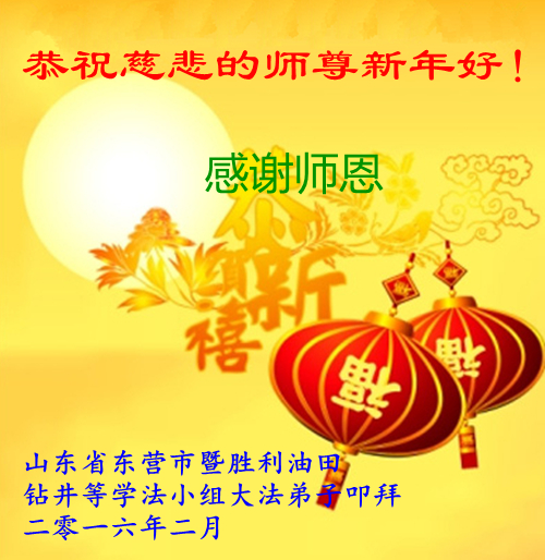弟子一定学好法,向内找,做好三件事,多救人,圆满随师还。弟子叩拜恭祝慈悲伟大的师父新年好! 黑龙江省伊春大法弟子 2016年2月3日(腊月二十五) 胜利油田钻井学法小组大法弟子恭祝师尊过年好!