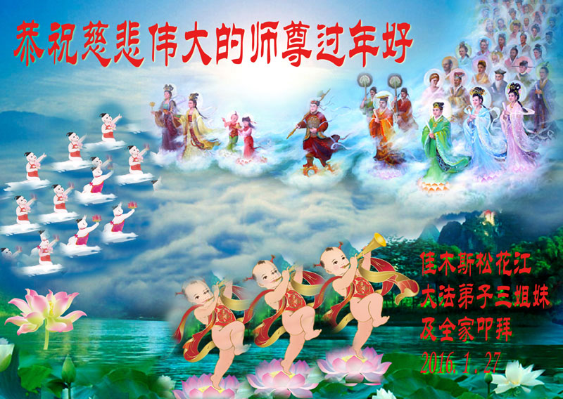 黑龙江省佳木斯松花江大法弟子三姐妹及全家恭祝慈悲伟大的师尊过年好!