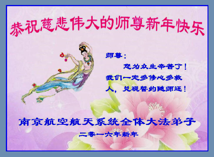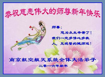 冬去春来又一年,弟子一定遵循师尊教诲,修炼如初,精進实修,做好三件事。 江苏省南京航空航天系统全体大法弟子恭祝师尊新年快乐!
