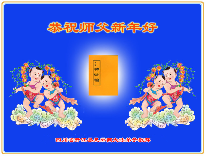 赞师父 阳光明媚照佛堂 师父端坐堂中央 慈悲拯救全人类 五湖四海喜洋洋 一大法弟子家属敬上 四川省达州市开江县兄弟俩大法弟子恭祝师父新年好!