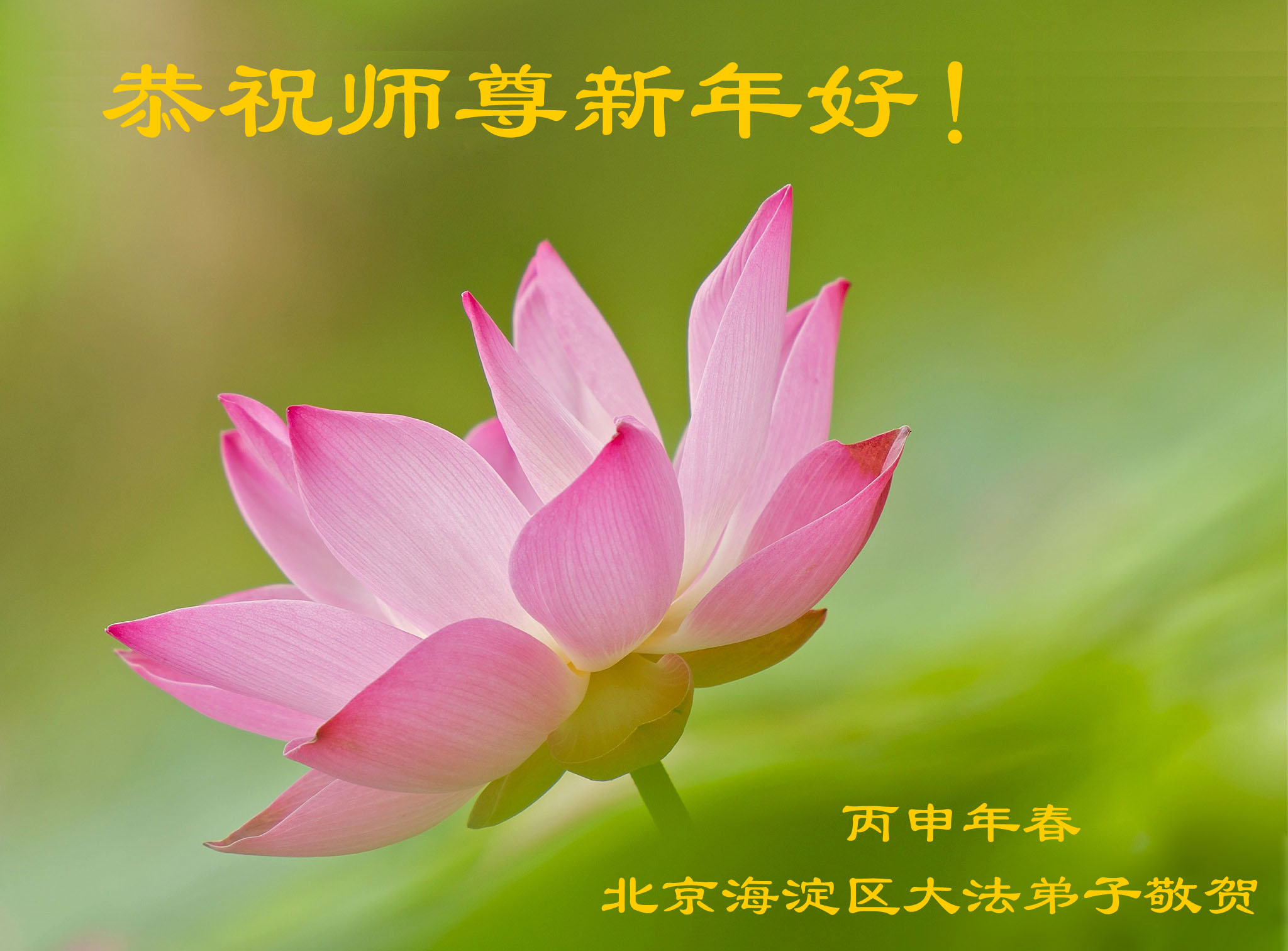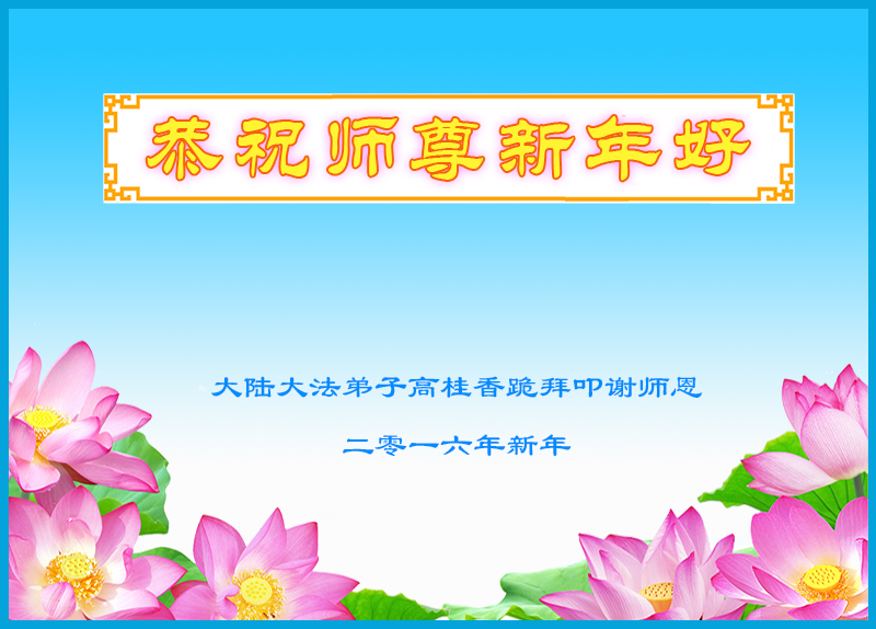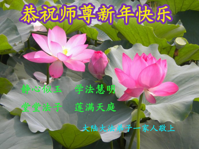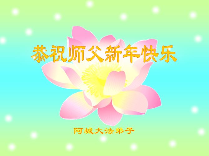 师父您好! 您辛苦了! 在修炼的路上每一步都离不开您的慈悲呵护,您为弟子操尽了心,您的大恩大德弟子无法表达,只有精進报师恩。在这新的一年里,我们一定要学好法,做好三件事,整体配合好,走师父安排的路,助师正法,救度被谎言蒙蔽的众生,兑现誓约。 大陆大法弟子恭祝师尊新年快乐!