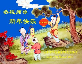 请师父放心,弟子们决不辜负师父的慈悲苦度!在新的一年里,我们一定努力的做好三件事,精進实修,互相配合好,在努力向内找,修好自己的同时,抓紧时间,多救人,快救人,完成我们的史前大愿,圆满随师还。 山东临沂大法弟子 2016年2月4日 山东临沂大法弟子恭祝师尊新年快乐!