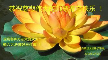 【明慧网二零一六年二月八日】 山西临汾全体大法弟子恭祝慈悲伟大的师父新年快乐!