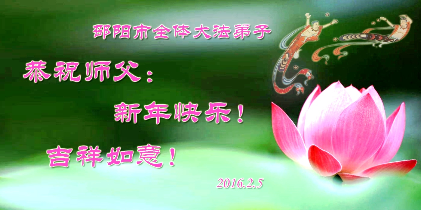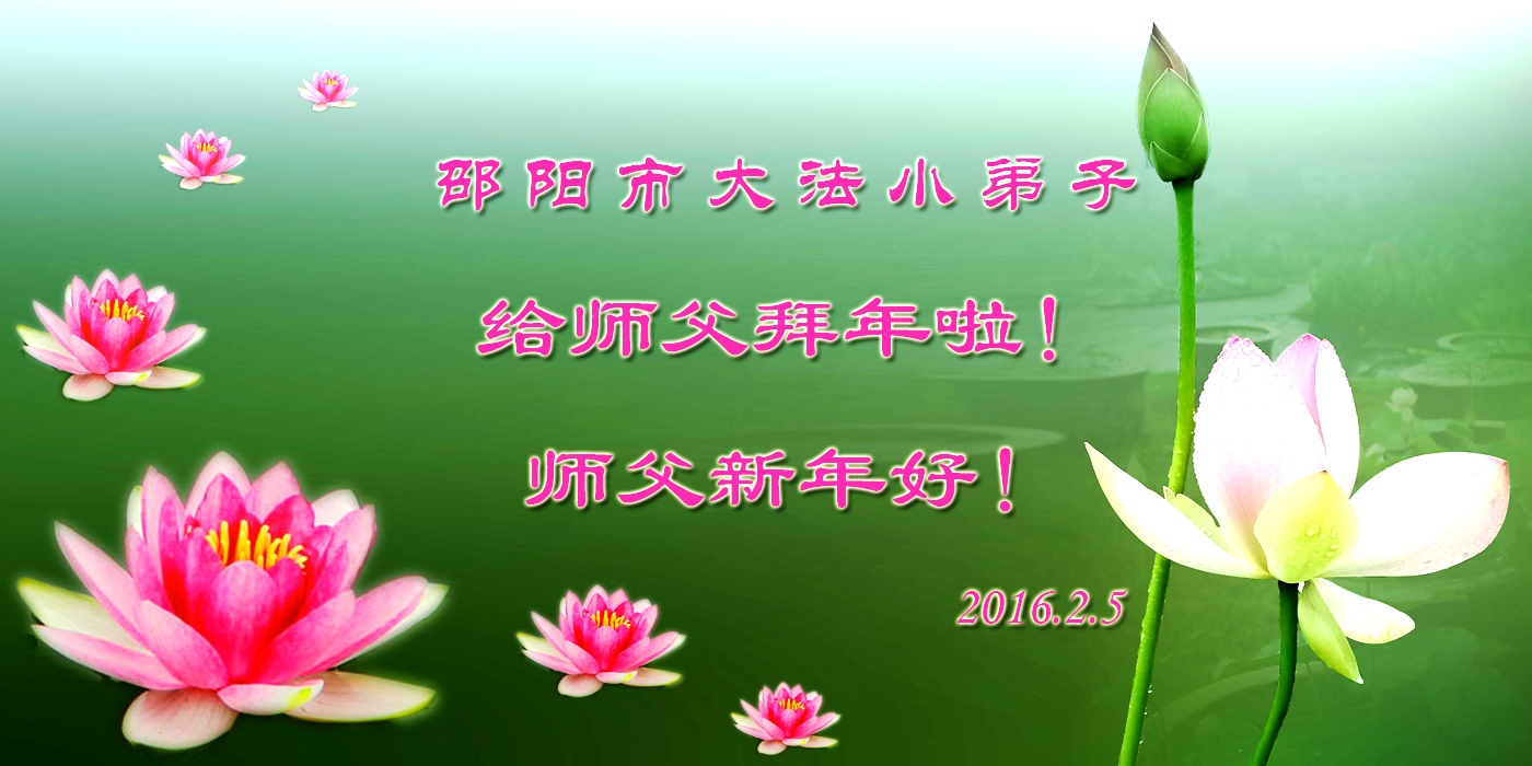 谢谢师父慈悲苦度!我们在新的一年里紧跟师父正法進程,勇猛精進,努力做好三件事,多救人,让师父宽心,兑现誓约,完成史前大愿!跟师父回家! 湖南常德市学法小组 二零一六年二月六日 湖南邵阳市全体大法弟子向师尊拜年:师尊过年好!